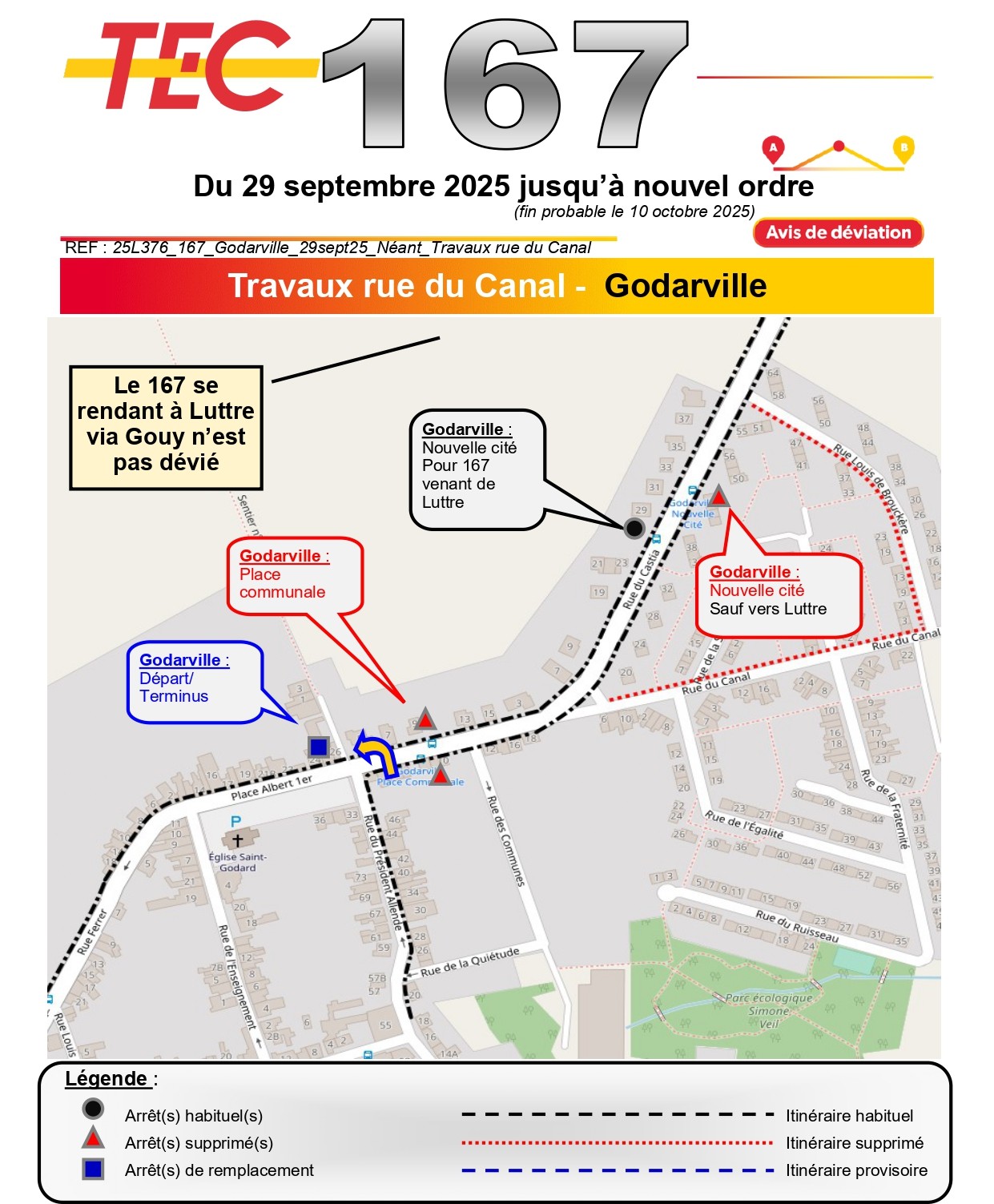Les services du TEC ont également émis un avis de déviation pour la ligne 167 pendant toute la durée des travaux.
